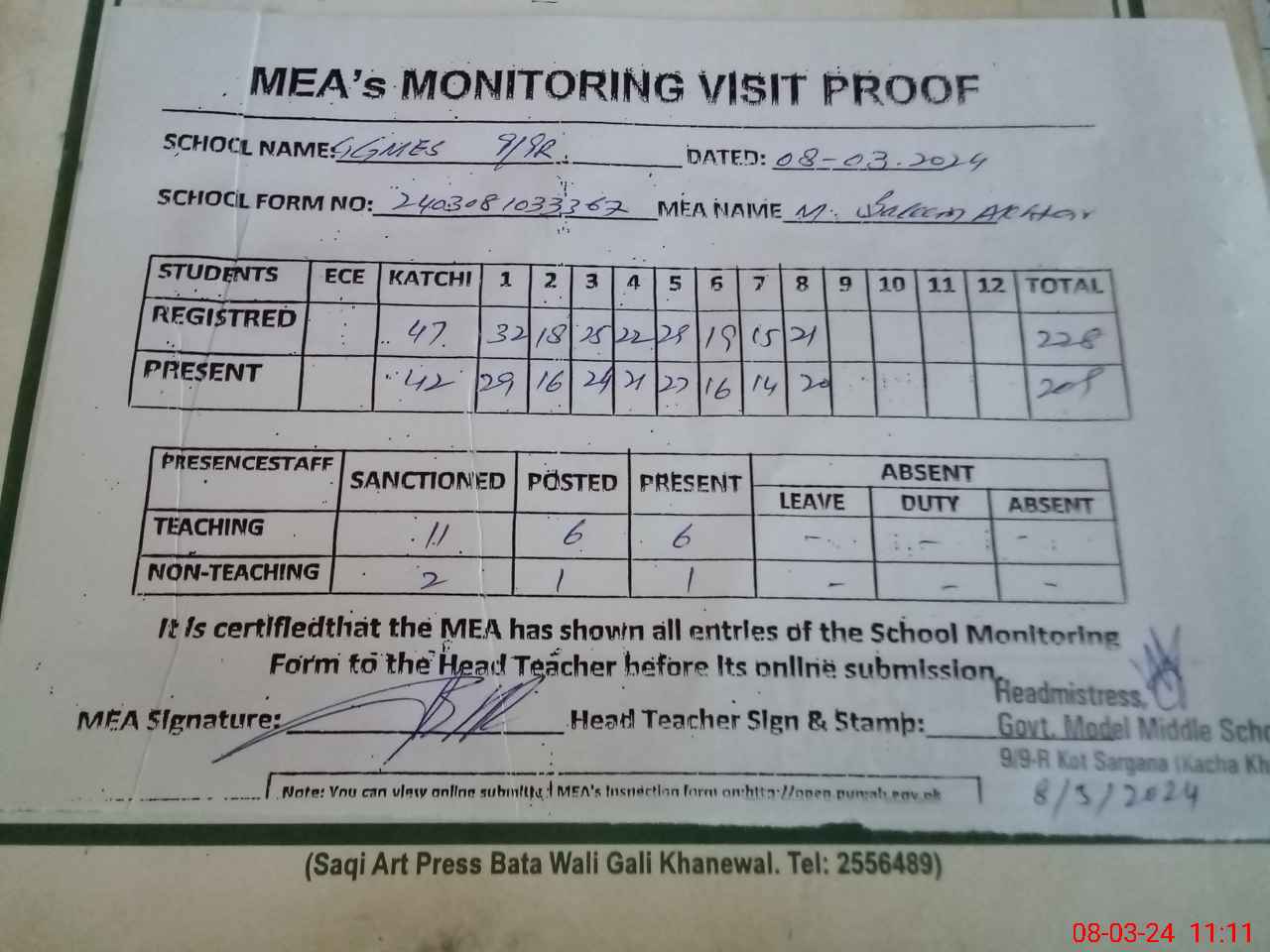 | Attendance Register | Head Teacher | MEA with School | Visit Proof |