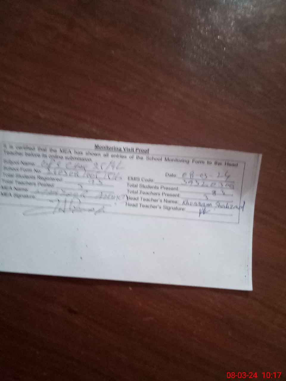 | Name: KH**** SH**** Designation: (School Headmaster's/Headmistress's) PST Phone/Cell Number: 03**** |