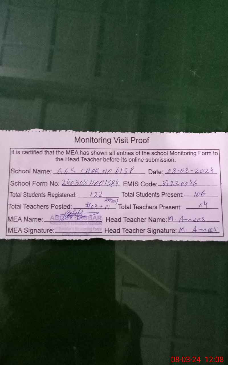 | EMIS Code: 39220046 | Name of School: GES CHAK NO. 61 / SP | |||