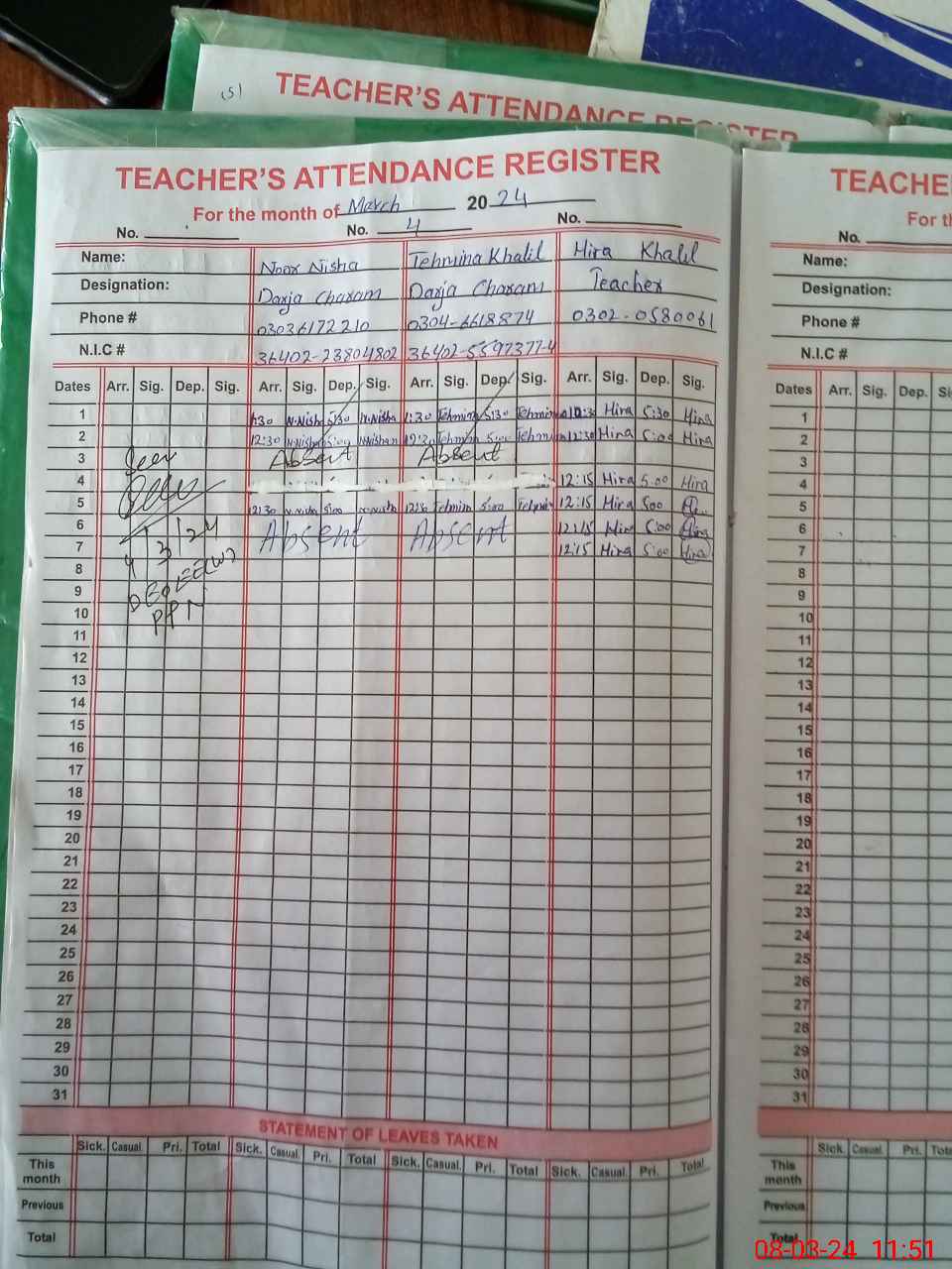 | CNIC | Full Name | Designation | R/C | Absence During Last Calender Month |