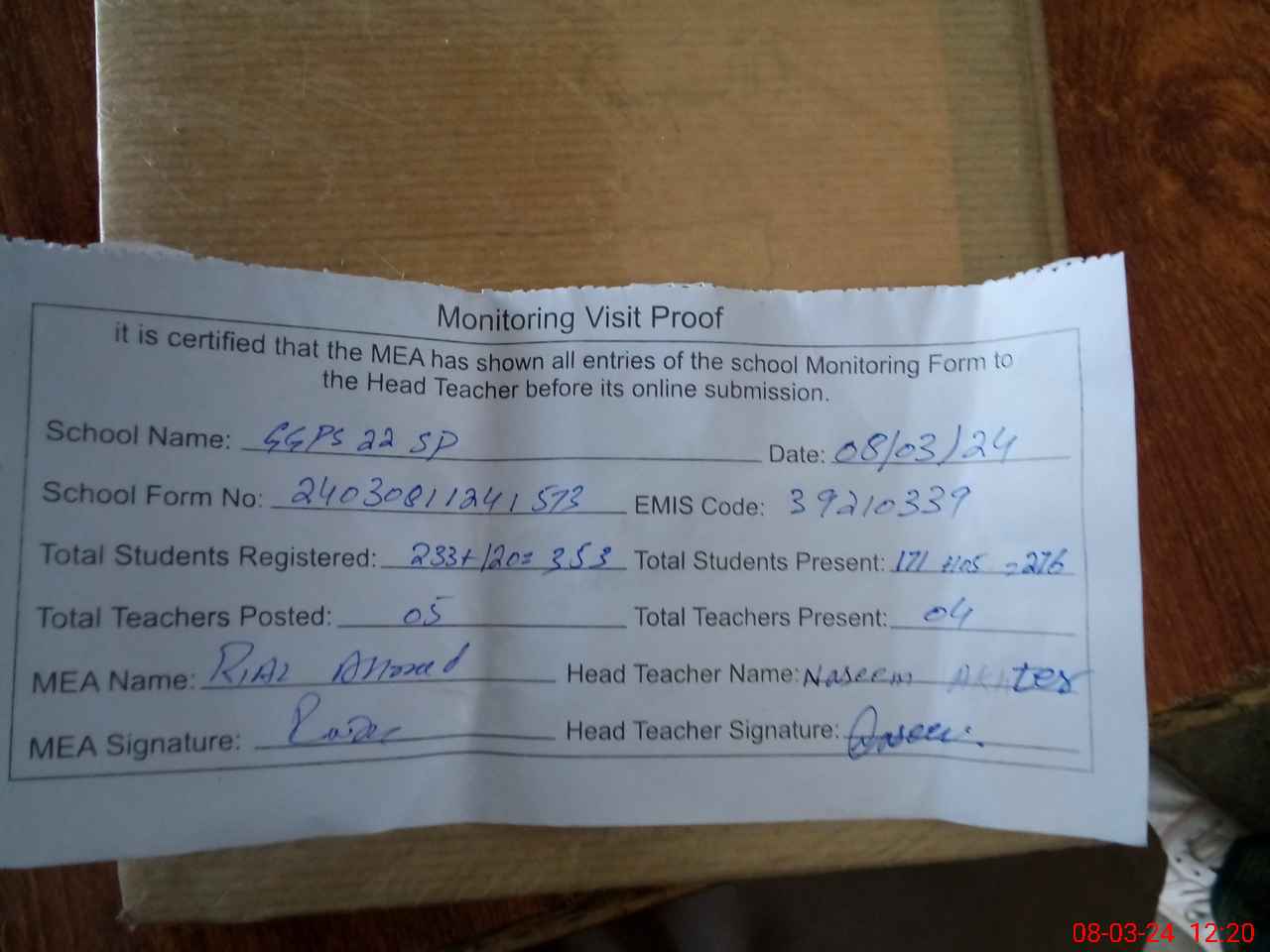 | Attendance Register | Head Teacher | MEA with School | Visit Proof |