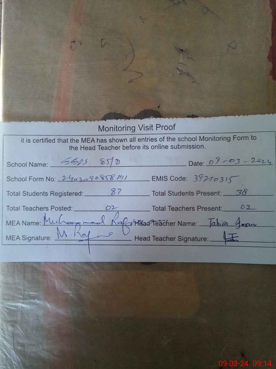 | Attendance Register | Head Teacher | MEA with School | Visit Proof |