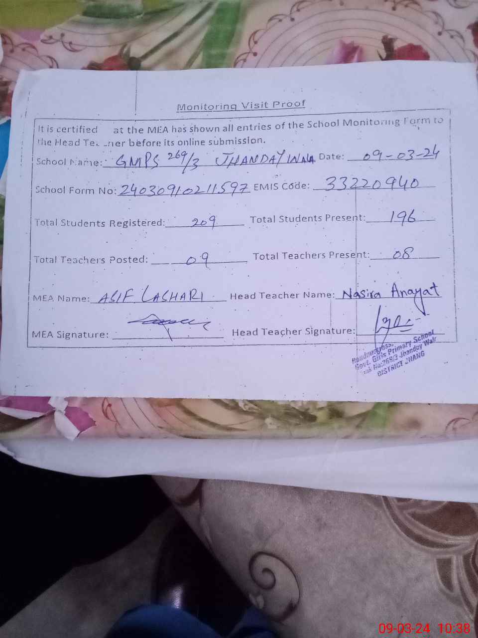 | Certified that this School was Inspected by the Undersigned MEA/DMO Today and the Information Stated Above is as Per Record. | |||||