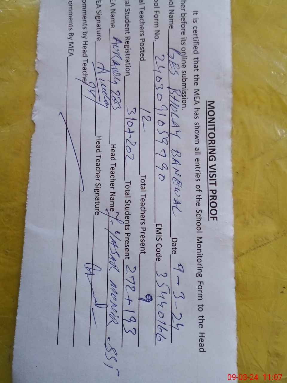 | Attendance Register | Head Teacher | MEA with School | Visit Proof |