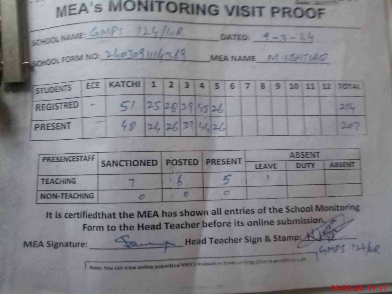 | Attendance Register | Head Teacher | MEA with School | Visit Proof |