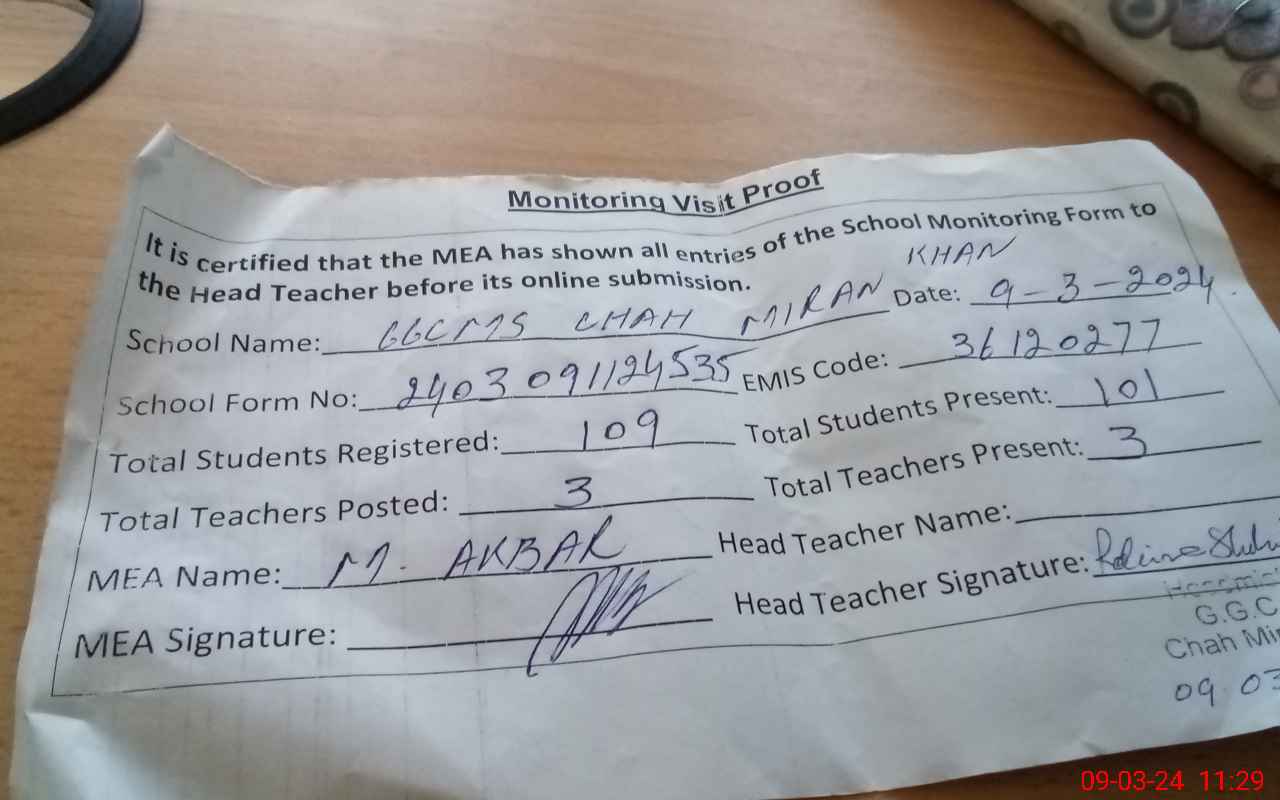 | EMIS Code: 36120277 | Name of School: GGCMS CHAH MIRAN KHAN | |||