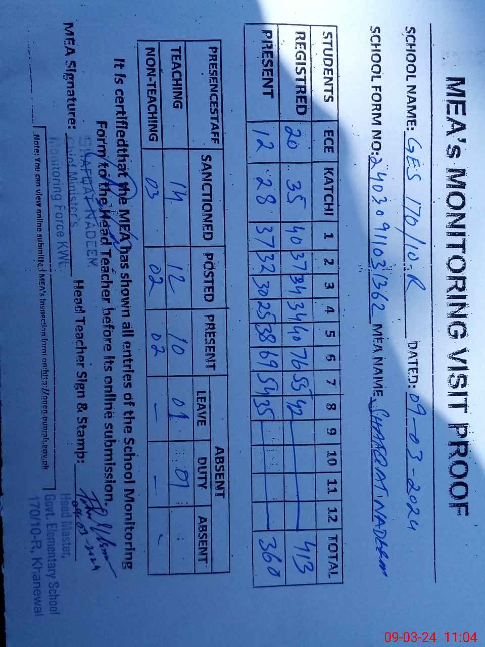 | Attendance Register | Head Teacher | MEA with School | Visit Proof |