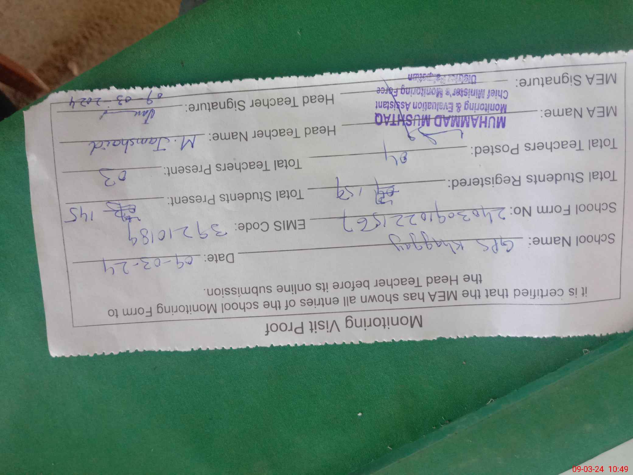 | Name: MU**** Ah**** Designation: (School Headmaster's/Headmistress's) PST Phone/Cell Number: 03**** |