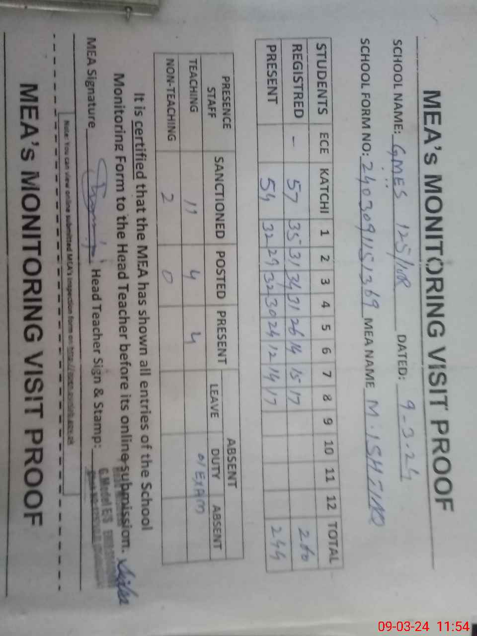 | Attendance Register | Head Teacher | MEA with School | Visit Proof |