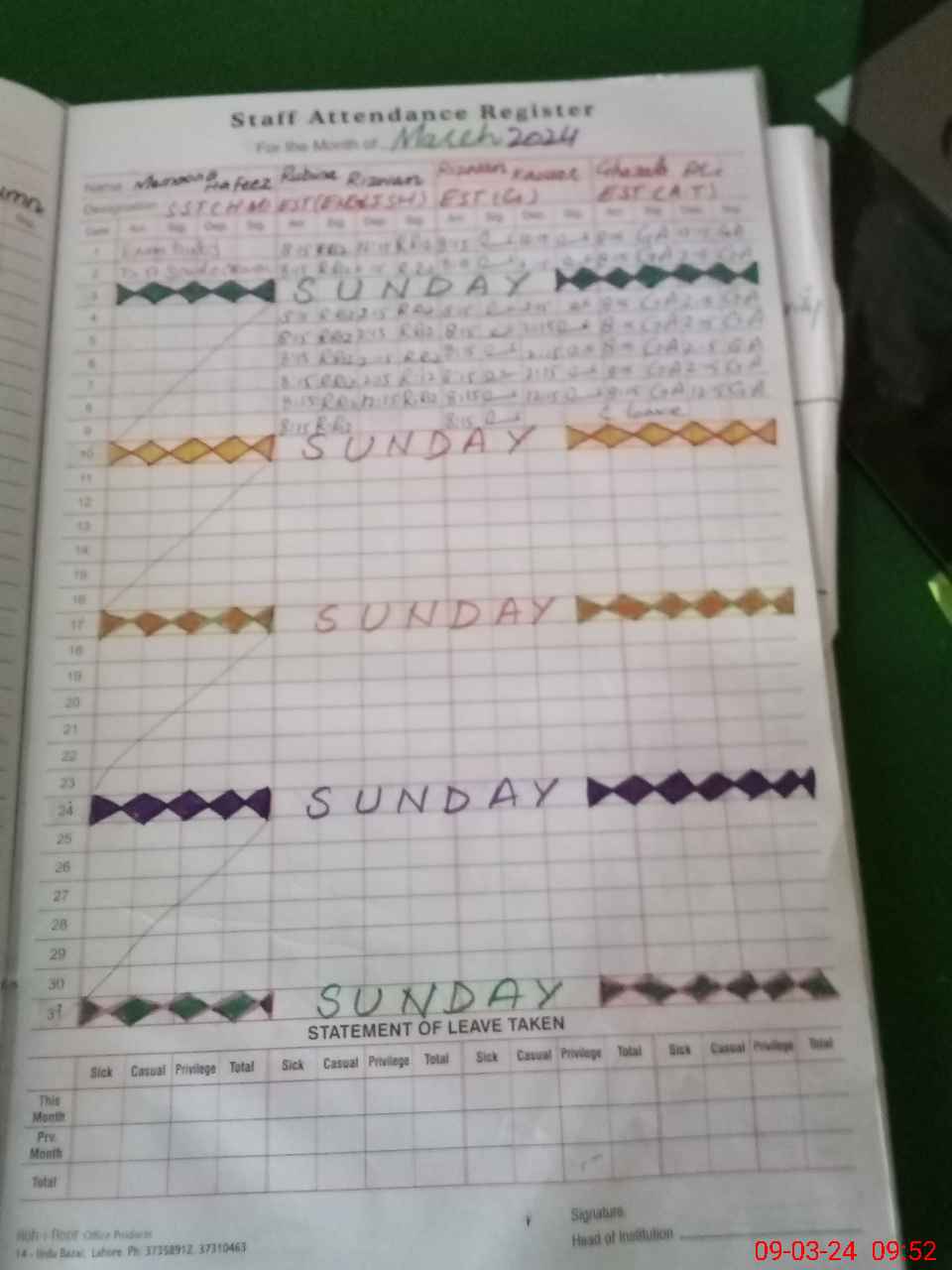 | CNIC | Full Name | Designation | R/C | Absence During Last Calender Month |