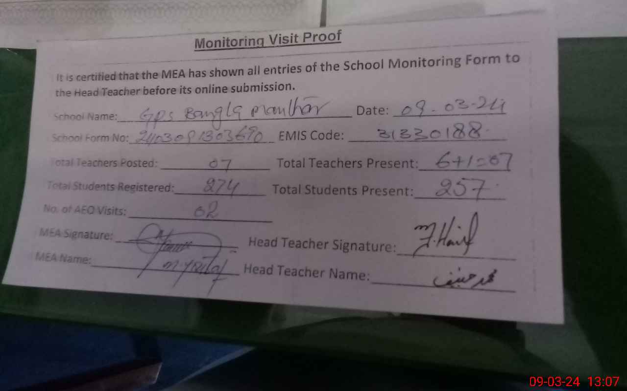 | EMIS Code: 31330188 | Name of School: GPS BANGLA MANTHAR | |||