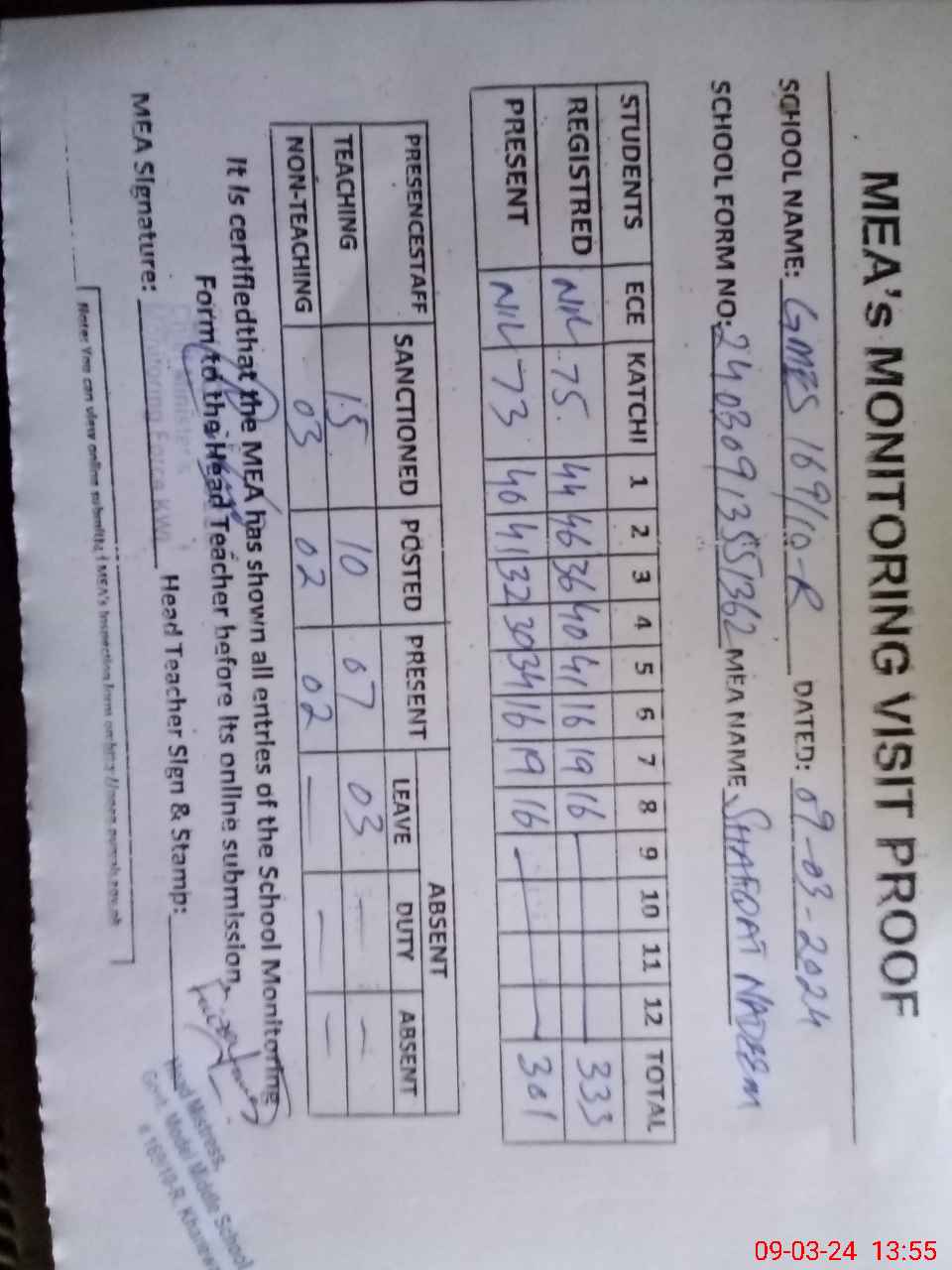 | Certified that this School was Inspected by the Undersigned MEA/DMO Today and the Information Stated Above is as Per Record. | |||||