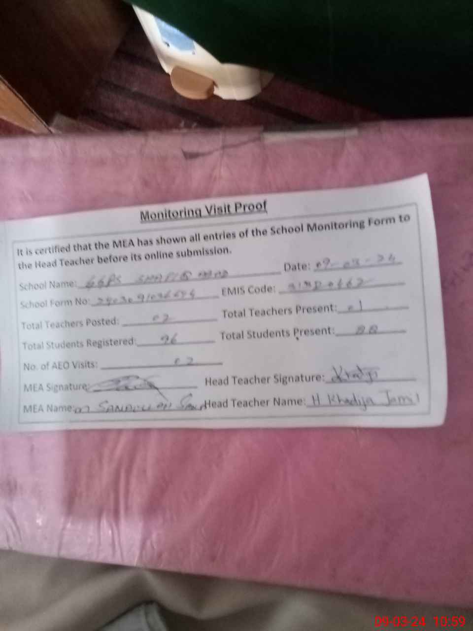 | Attendance Register | Head Teacher | MEA with School | Visit Proof |