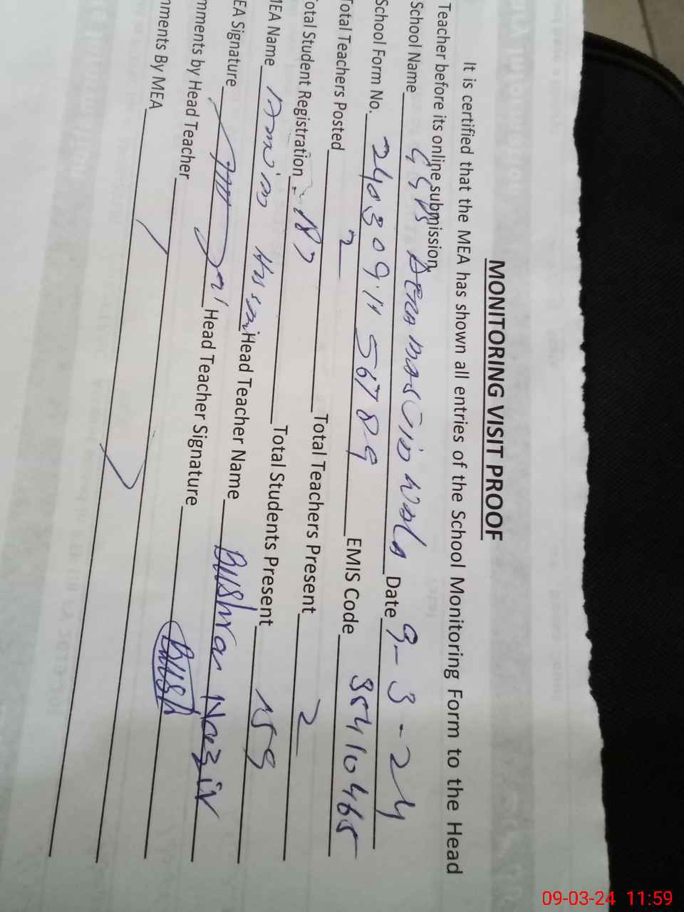 | Attendance Register | Head Teacher | MEA with School | Visit Proof |
