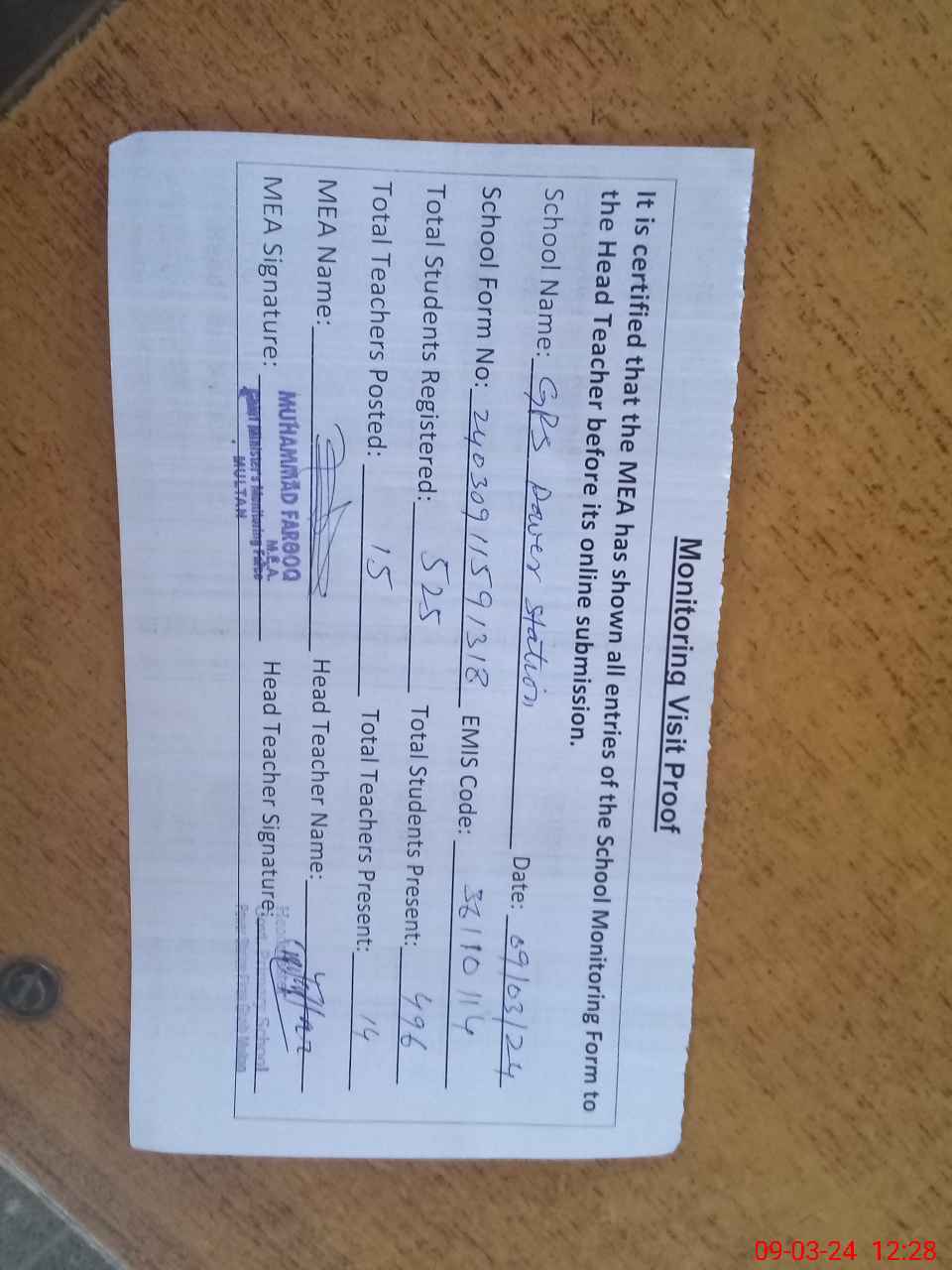 | Attendance Register | Head Teacher | MEA with School | Visit Proof |