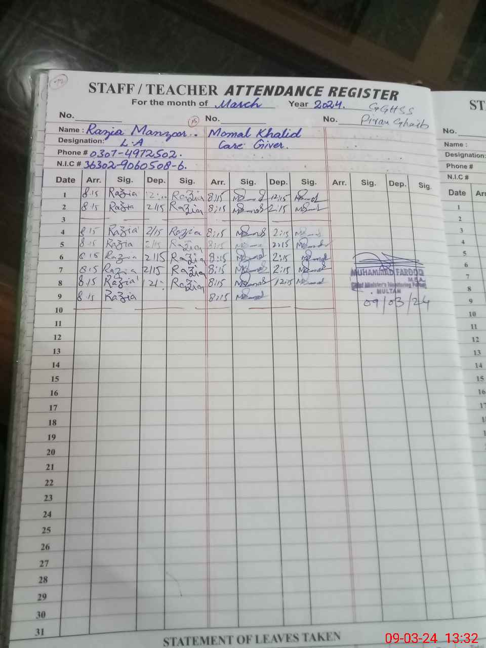 | CNIC | Full Name | Designation | R/C | Absence During Last Calender Month |