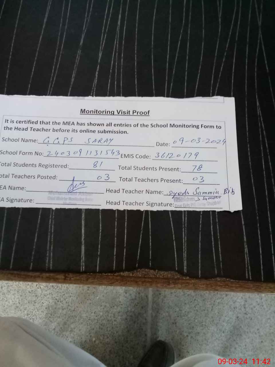 | Attendance Register | Head Teacher | MEA with School | Visit Proof |