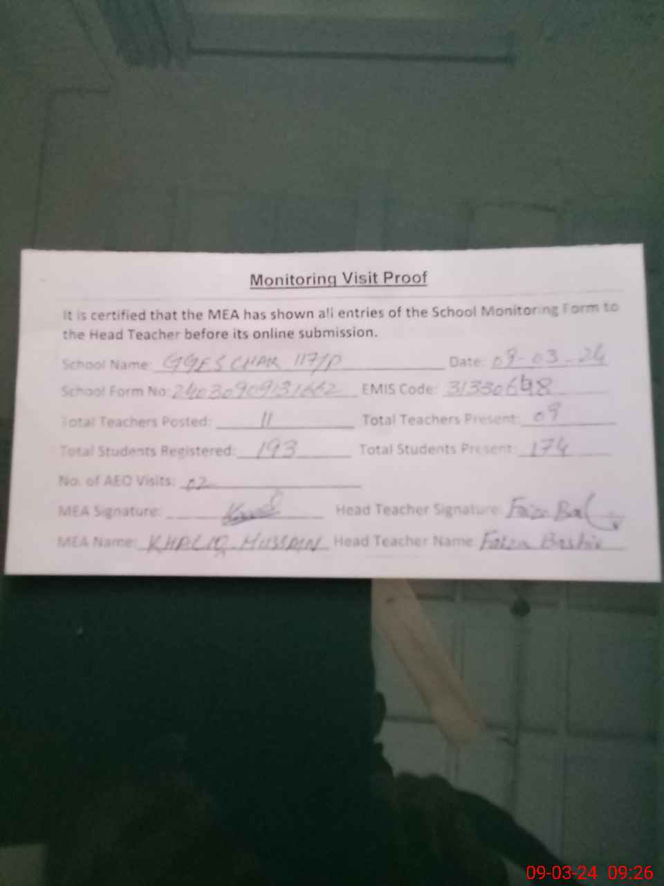 | Monitoring Date: 09-03-2024 | Start Time: 09-03-2024 08:59 AM | End Time: 09-03-2024 09:26 AM | Name of MEA: Kh**** Hu**** | |