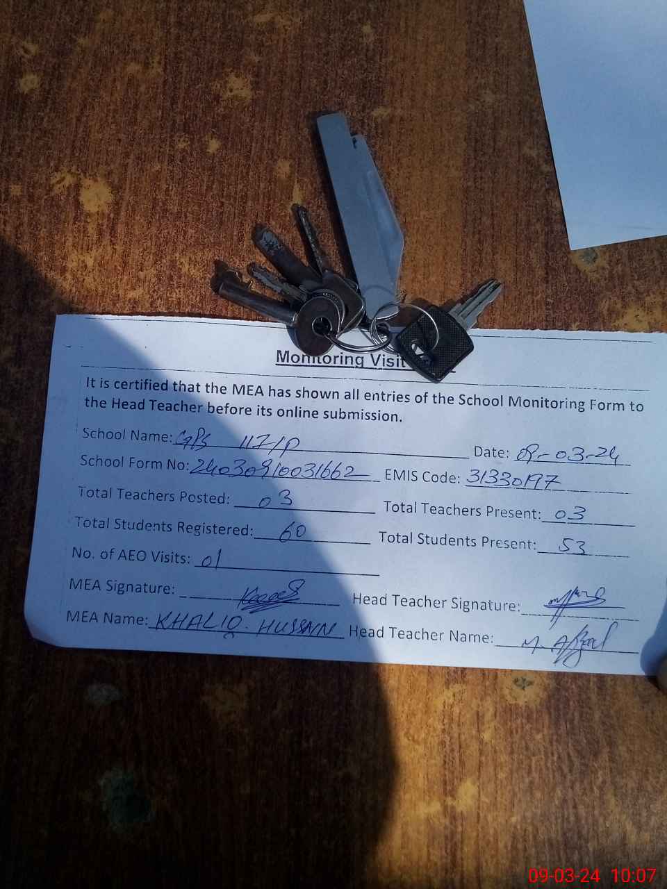 | Monitoring Date: 09-03-2024 | Start Time: 09-03-2024 09:34 AM | End Time: 09-03-2024 10:07 AM | Name of MEA: Kh**** Hu**** | |