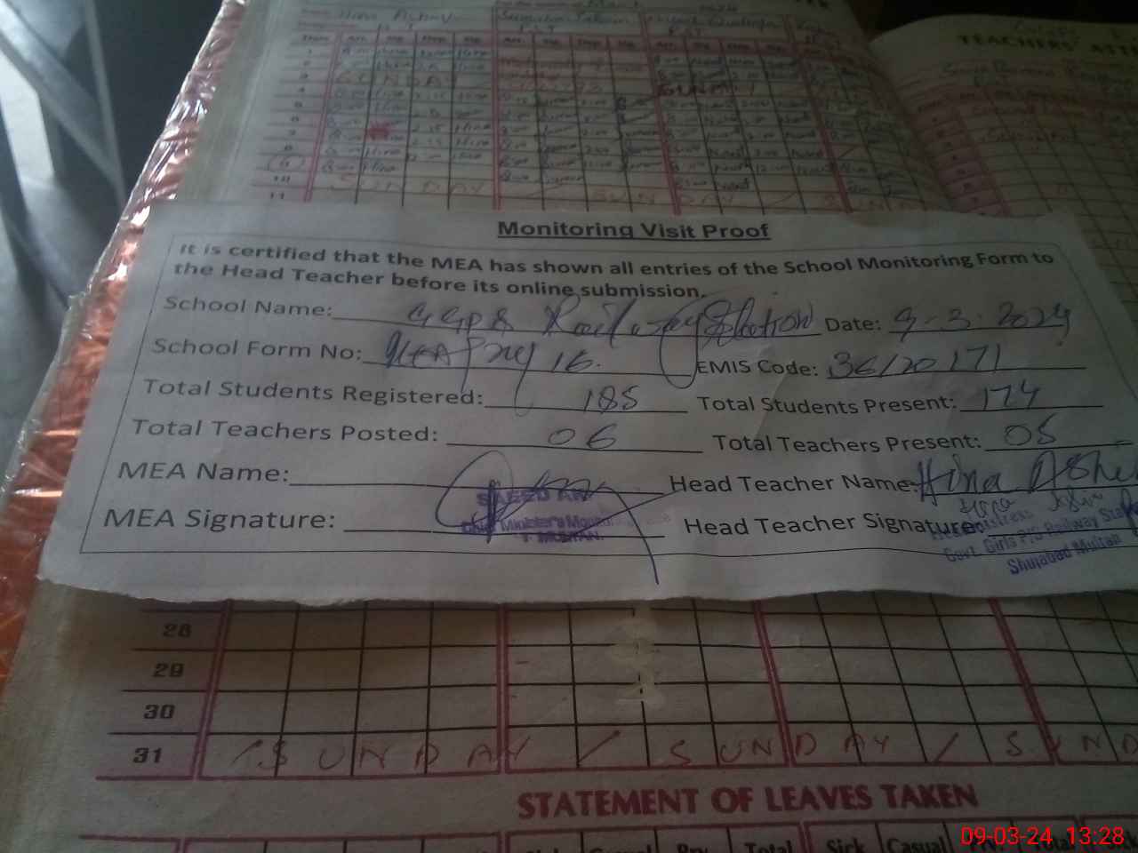 | Attendance Register | Head Teacher | MEA with School | Visit Proof |
