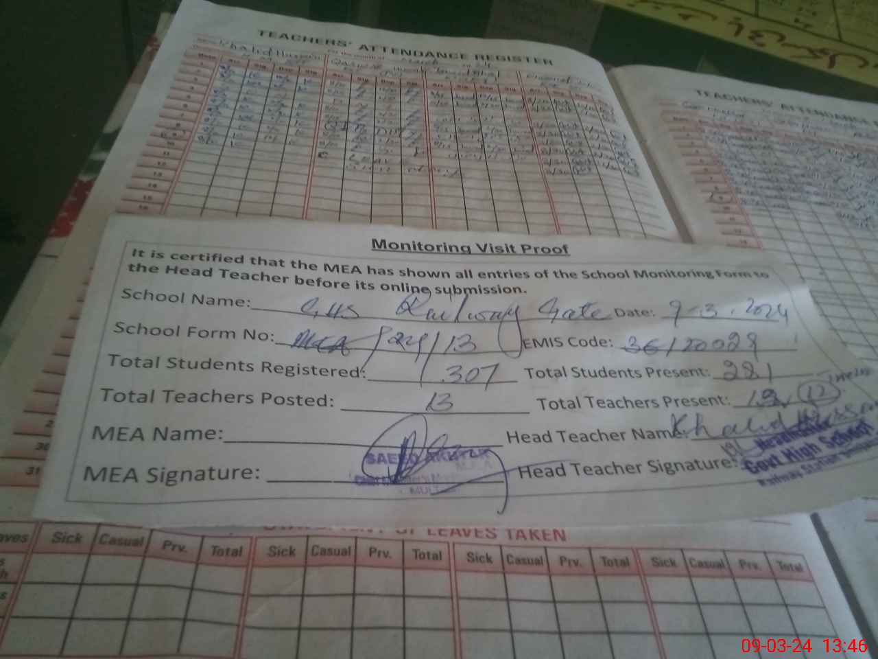 | Attendance Register | Head Teacher | MEA with School | Visit Proof |
