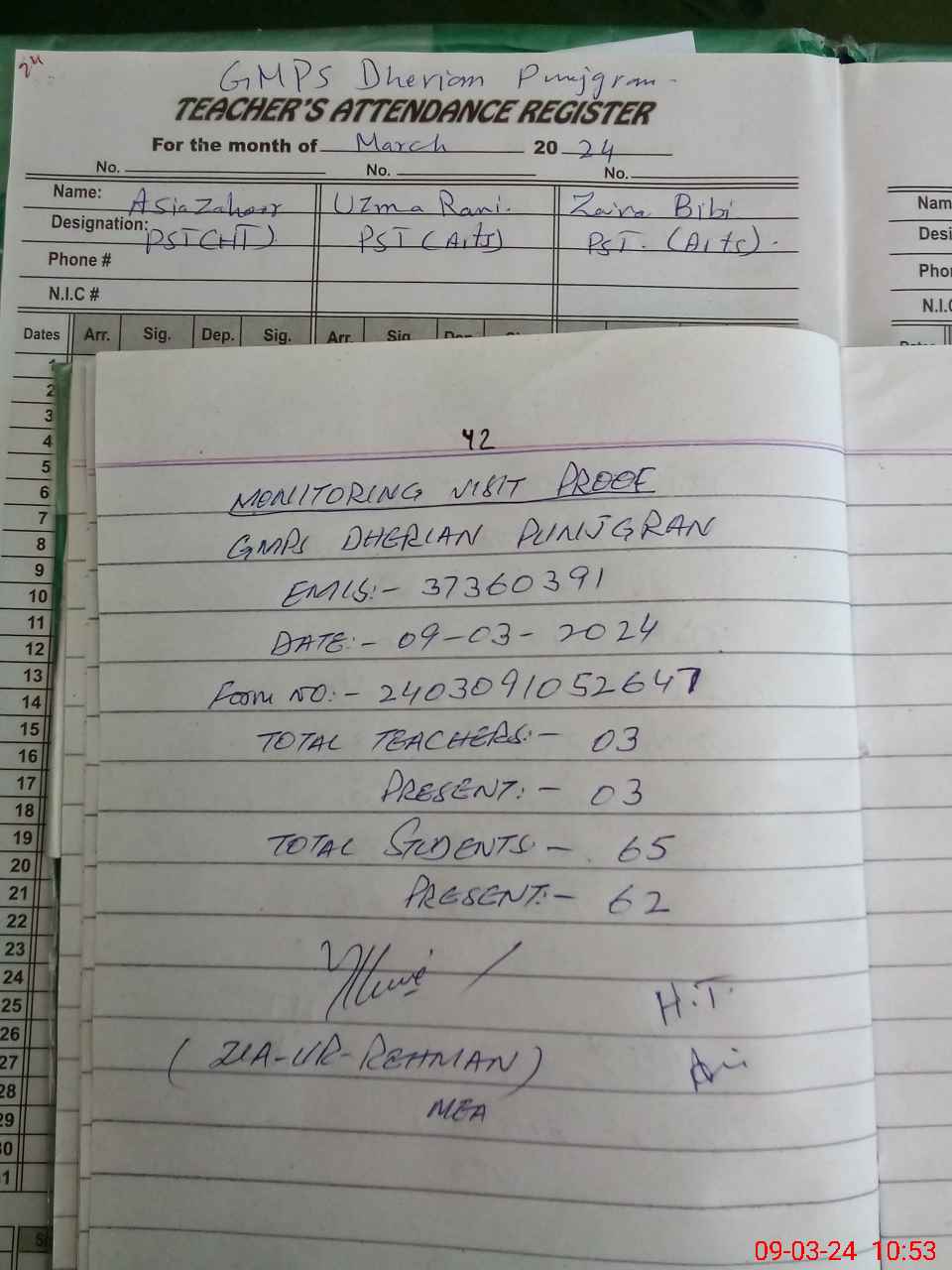 | Attendance Register | Head Teacher | MEA with School | Visit Proof |