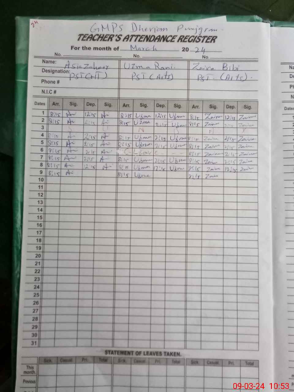 | Leave | Duty | Absent | Maternity | Medical | Ex- Pak |