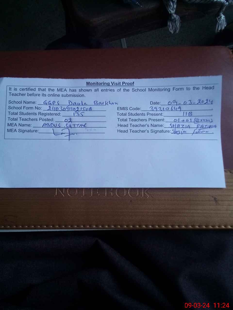 | Attendance Register | Head Teacher | MEA with School | Visit Proof |