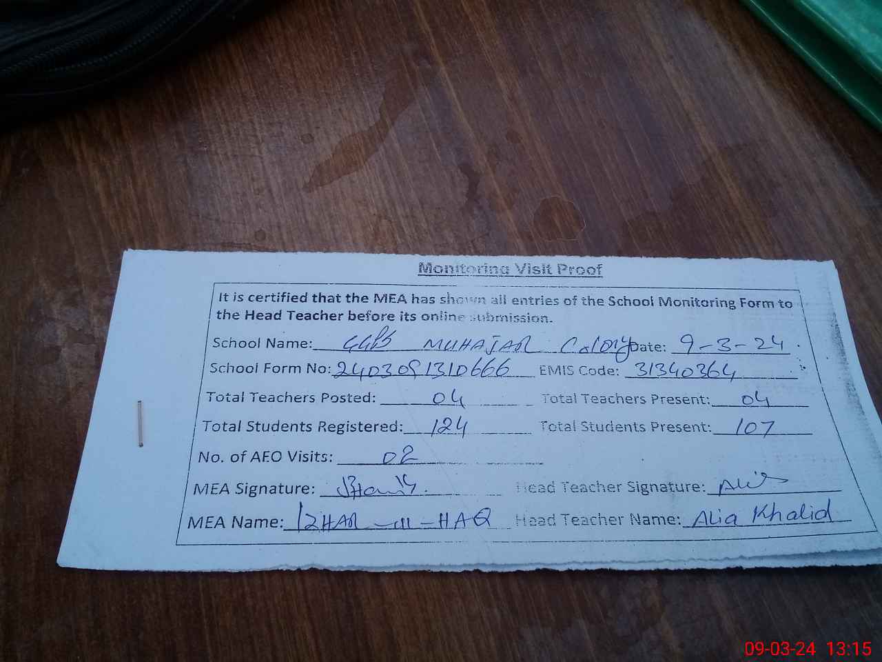 | Attendance Register | Head Teacher | MEA with School | Visit Proof |