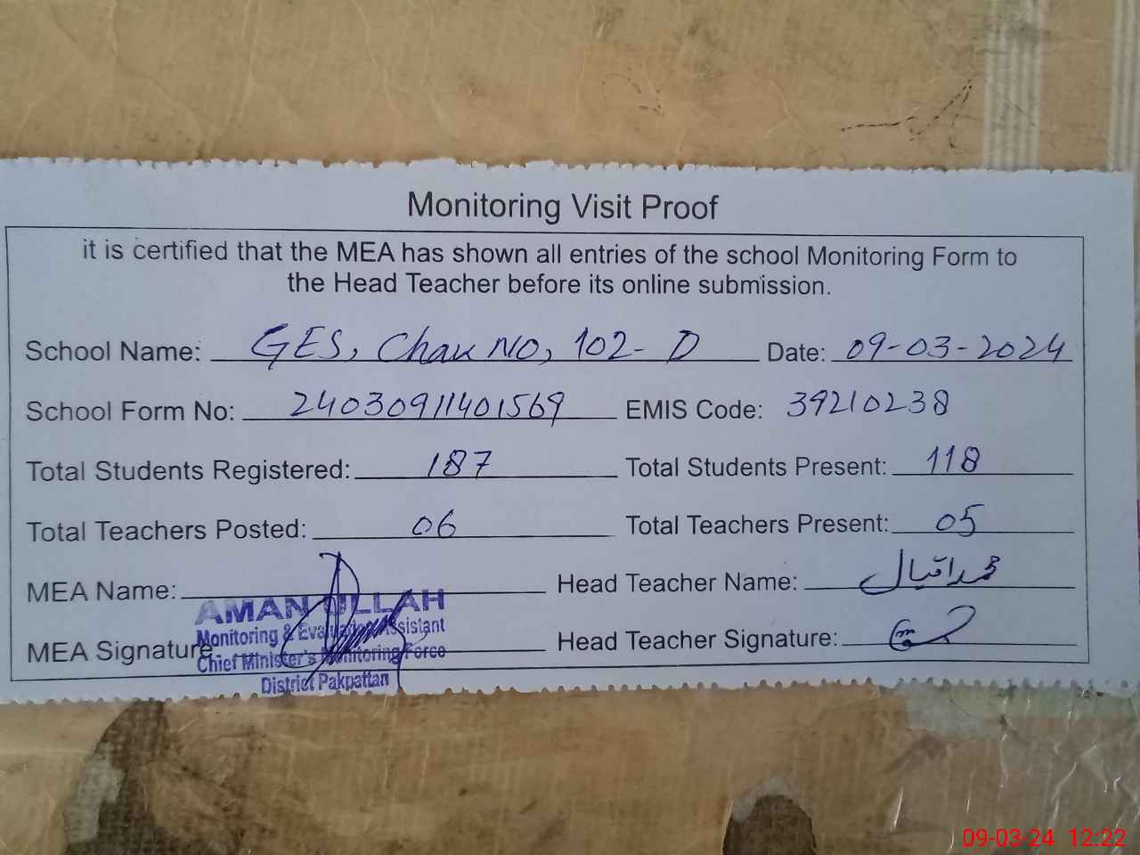 | EMIS Code: 39210238 | Name of School: GES CHAK NO. 102 /D | |||