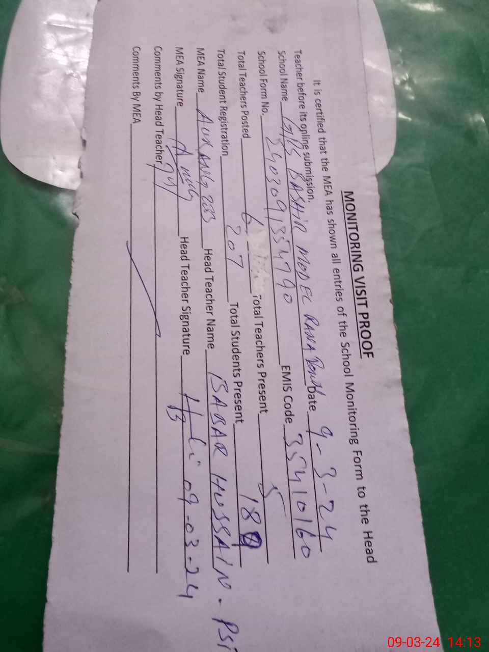 | Attendance Register | Head Teacher | MEA with School | Visit Proof |