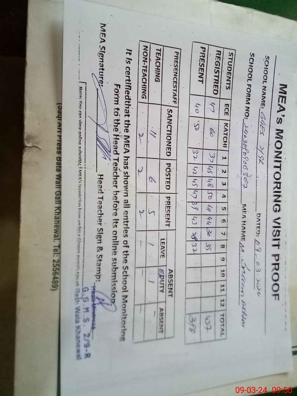 | Attendance Register | Head Teacher | MEA with School | Visit Proof |