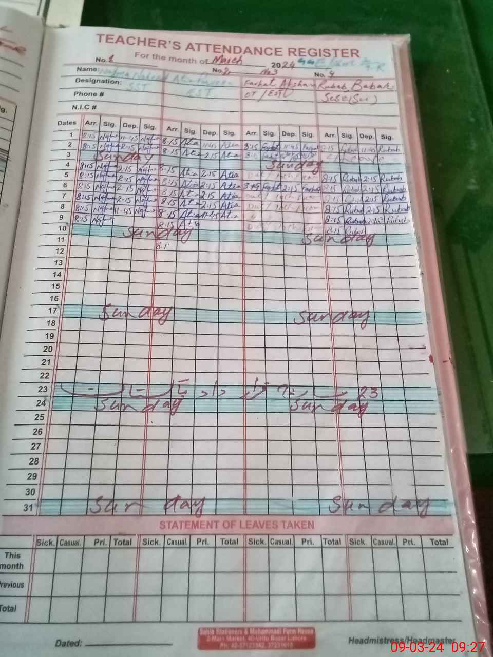 | CNIC | Full Name | Designation | R/C | Absence During Last Calender Month |