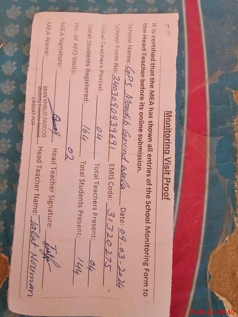 | Attendance Register | Head Teacher | MEA with School | Visit Proof |