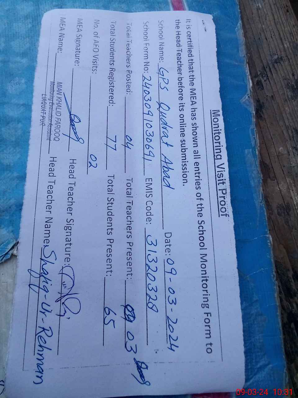 | Attendance Register | Head Teacher | MEA with School | Visit Proof |