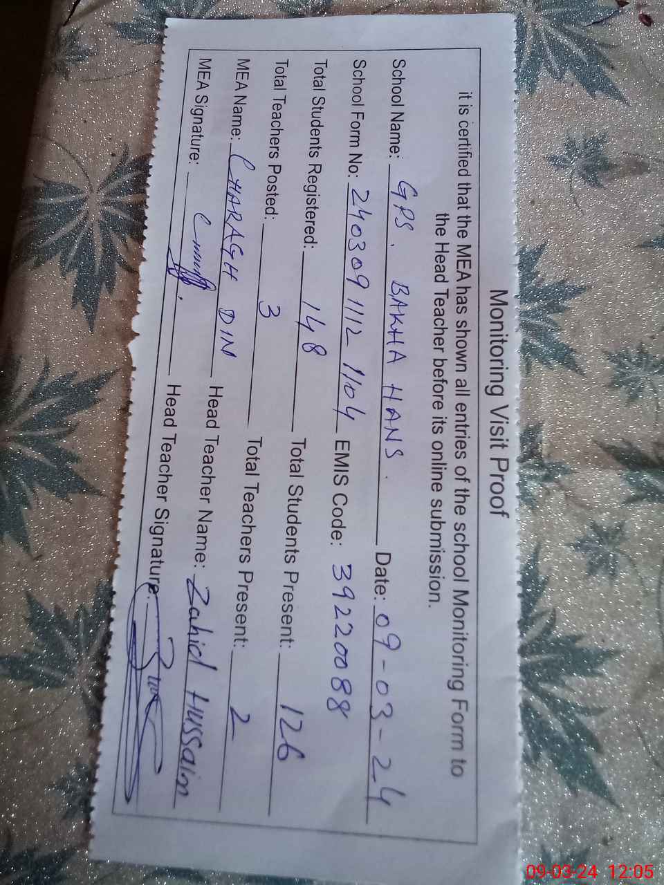 | Attendance Register | Head Teacher | MEA with School | Visit Proof |