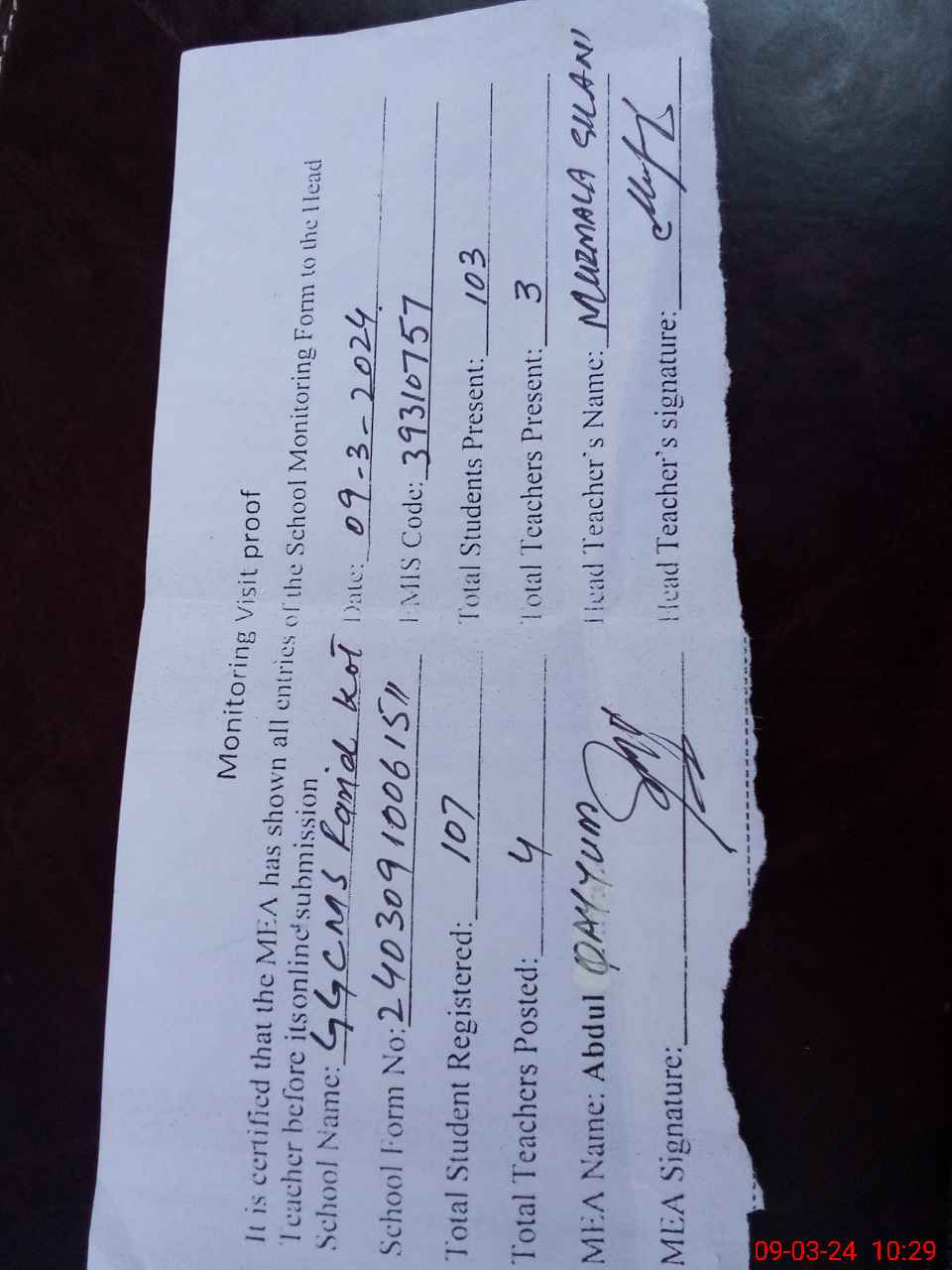 | Attendance Register | Head Teacher | MEA with School | Visit Proof |