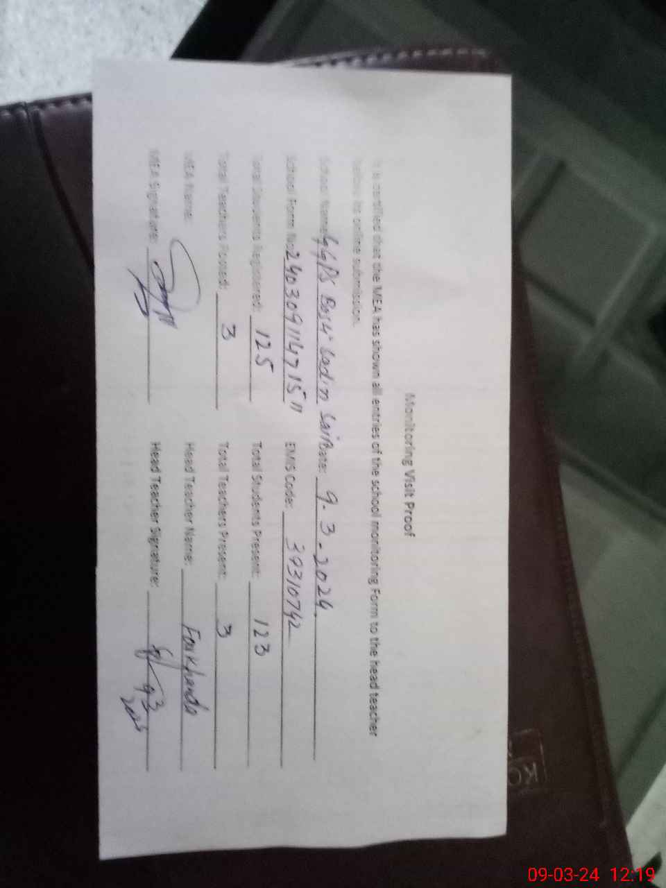 | Attendance Register | Head Teacher | MEA with School | Visit Proof |