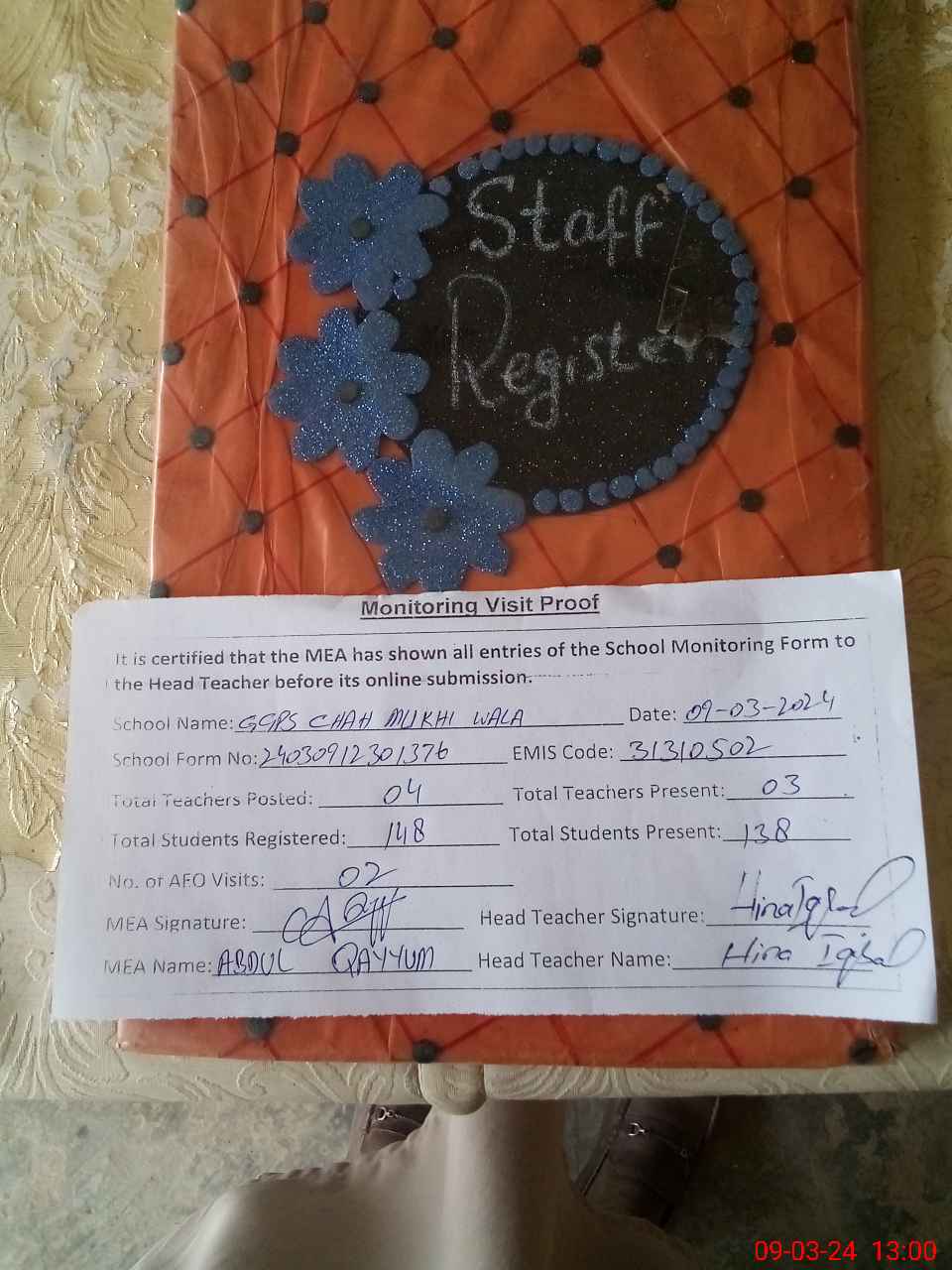 | Attendance Register | Head Teacher | MEA with School | Visit Proof |