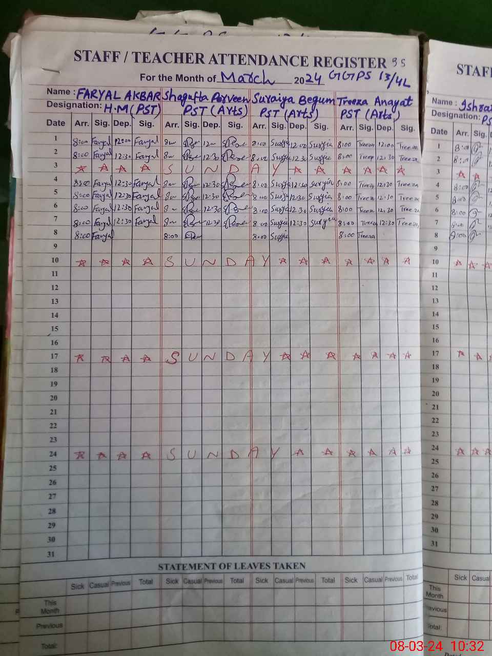 | Leave | Duty | Absent | Maternity | Medical | Ex- Pak |