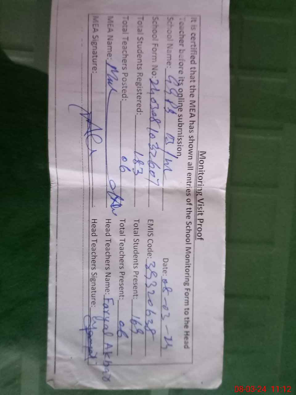 | Attendance Register | Head Teacher | MEA with School | Visit Proof |