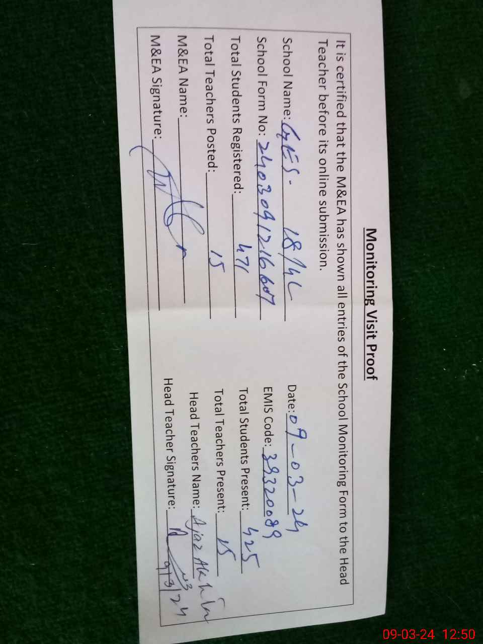 | Attendance Register | Head Teacher | MEA with School | Visit Proof |