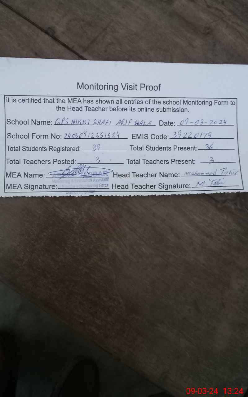 | EMIS Code: 39220179 | Name of School: GPS NIKKI SHAFI P/O SHAFI ARIFWALA | |||