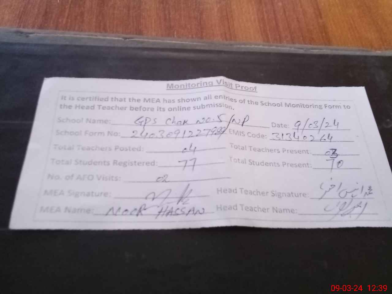 | Attendance Register | Head Teacher | MEA with School | Visit Proof |