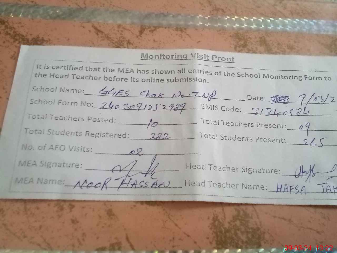 | Attendance Register | Head Teacher | MEA with School | Visit Proof |