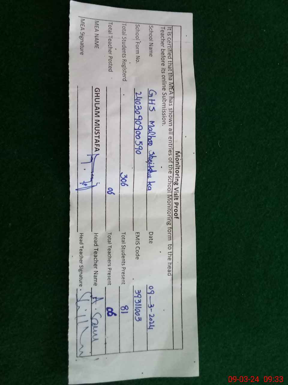 | EMIS Code: 39311003 | Name of School: GHS MALHOO SHEIKHU KA | |||