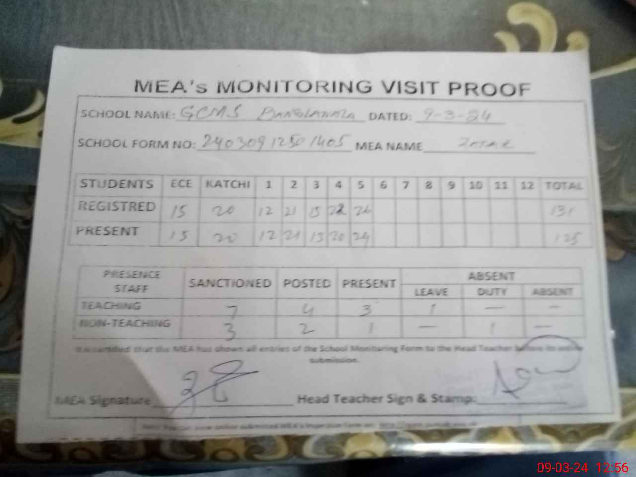 | EMIS Code: 36410382 | Name of School: GGCMS BANGLAY WALA, P/O KUKKAR HATTA, KABIRWALA | |||