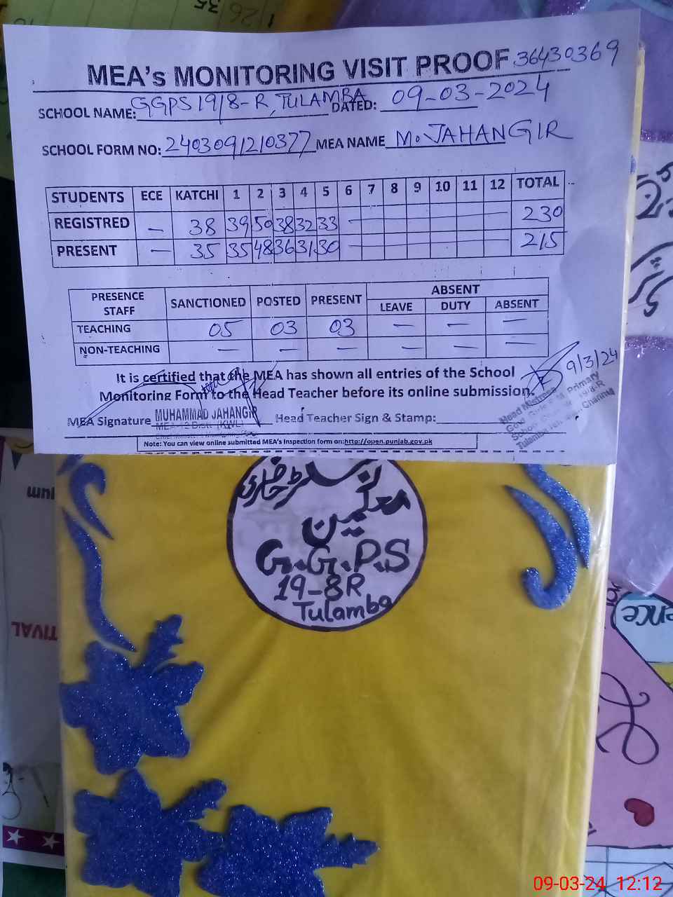 | Attendance Register | Head Teacher | MEA with School | Visit Proof |