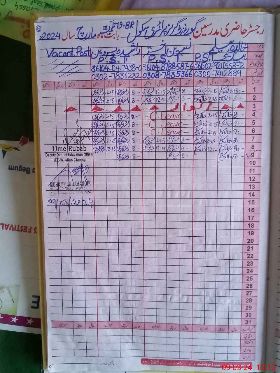 | Name: KH**** SA**** Designation: (School Headmaster's/Headmistress's) PST Phone/Cell Number: 03**** |