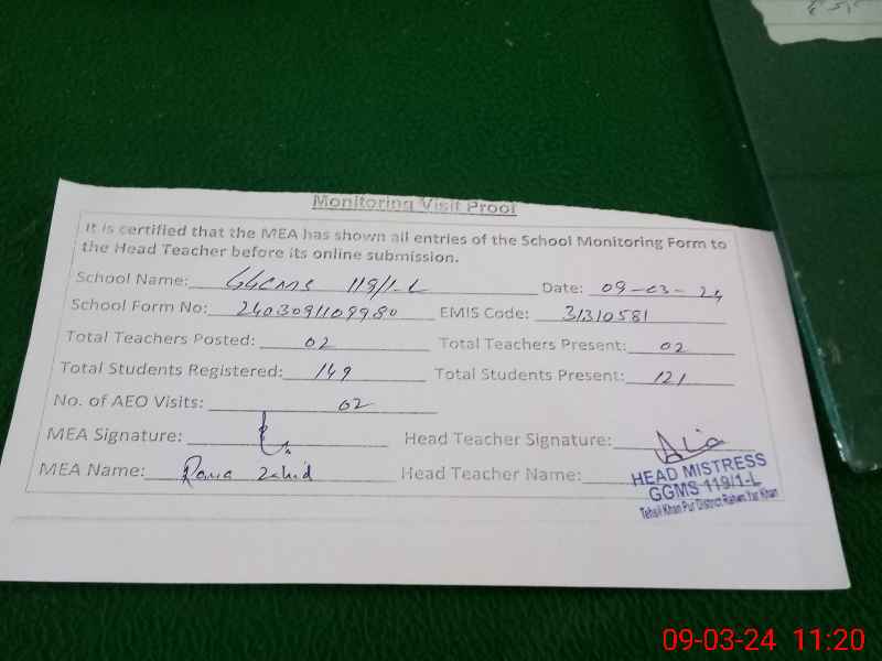 | Certified that this School was Inspected by the Undersigned MEA/DMO Today and the Information Stated Above is as Per Record. | |||||